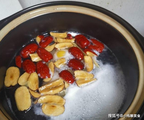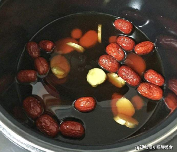 3,燉鍋中加上適量的清水,把生薑,紅棗放在鍋中,大火煮開。