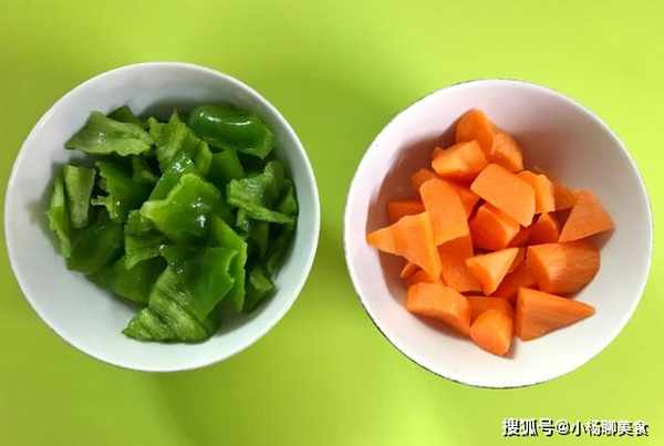 4、胡蘿蔔去皮以後清洗乾淨,切成小塊,青椒去掉裡面的籽也切成小塊以後備用。