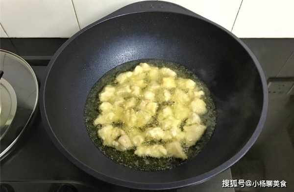 7、鍋裡面加入適量的食用油,燒至6成熱,再將雞塊放進鍋裡面,中小火慢炸至熟。將炸好了的雞塊撈出來再次放進鍋裡面,迅速地複炸至金黃色以後撈出來。