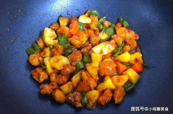 9、翻炒均勻以後,將鳳梨倒進去,翻炒均勻以後加入糖醋汁,快速地翻拌,再加入少量的水澱粉勾芡一下就可以關火了。色香味俱全,酸甜爽口又開胃的鳳梨咕咾肉。