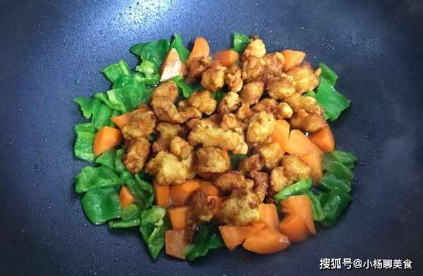 8、鍋裡面留底油,把青椒還有胡蘿蔔塊都一起放進去翻炒至斷生,盛出來以後再將炸好的雞塊下進鍋裡面。