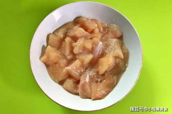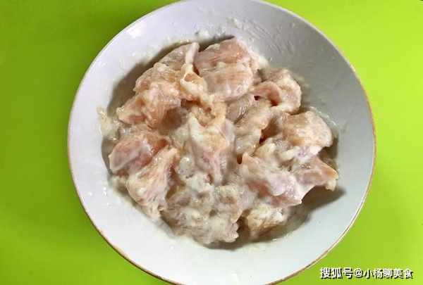 6、醃制好的雞胸肉加入一個蛋清攪拌均勻以後裹上澱粉。放澱粉不僅能讓肉片很好地掛上漿,還能鎖住雞肉的水分,吃起來也不乾柴。