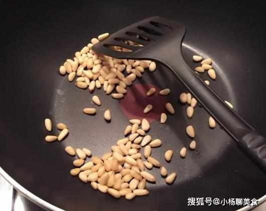步驟三:鍋燒熱不放油,倒入松仁幹炒一下,這樣會更清脆。