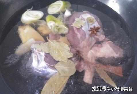 步驟二:鍋內放入牛肉、薑片、葱段、桂皮、香葉、八角,倒入適量料酒,大火燒開,換成小火慢燉40分鐘。
