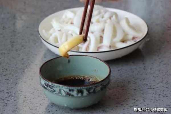 3、水烧开后放入墨鱼,大火烫45秒左右,一边烫一边搅拌,不能烫时间超过1分钟,不然墨鱼会老。4、搅拌一下捞出来放入凉开水中,过一遍凉开水,之后捞出来。再调一个料汁,碗中倒入生抽,再放点芥末,搅拌均匀。吃的时候夹1片墨鱼,蘸一下料汁就可以吃了。小贴士: