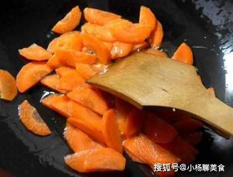 第四步,快速翻炒下,待慢慢將胡蘿蔔片炒至微微發軟的時候,便可將山藥片從水中撈出,並且控下水,翻入在鍋中;