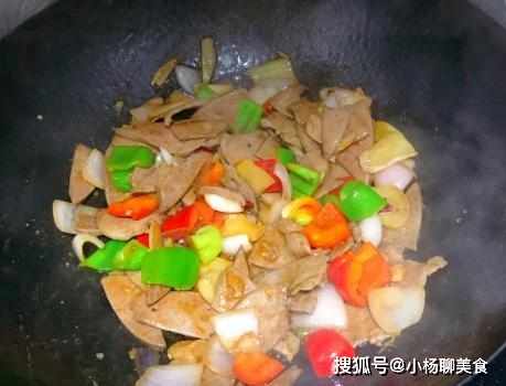 3、洋葱和辣椒不用炒太長的時間,在出鍋前放入,炒至斷生就可以了,因為猪肝醃制的時候已經有了基本的味道,囙此最後只需要加上點鹽調味便可。