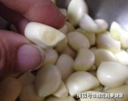 第二步:蒜剝好之後,把裡面不好的、不完整的蒜丟掉不要,再用刀把蒜瓣的底部切掉一小塊,這樣能够增大大蒜和醋的接觸面積,從而讓蒜吸收醋吸收的更快,讓蒜能够快速變綠,等到大蒜都處理好之後放在旁邊備用。注意:蒜不能沾水,有水的蒜,在浸泡的時候容易變質。