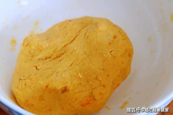 步驟5,重複上面的步驟,在紅甘薯泥中倒入紅薯澱粉,揉成麵團。