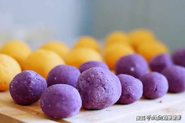 步驟6,將紅甘薯麵團分割成大小均勻的劑子,搓圓成球狀。然後取出紫薯麵團,分割成劑子,搓成球狀。當然,你也可以搓成你喜歡的各種形狀。