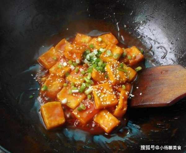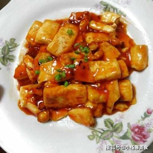 在加入豆腐煮制,稍微沸騰一會就可以放入青紅椒末了,然後再來一點水澱粉勾芡,湯汁濃稠,掛在豆腐上就可以起鍋了,這樣的豆腐要比平常燒的味道好多了,在最前期煎至的時候也可以過上雞蛋液在裹上澱粉,這樣是為了讓豆腐更加金黃。這道家常版的脆皮豆腐就做好了,最後撒上蔥花點綴。