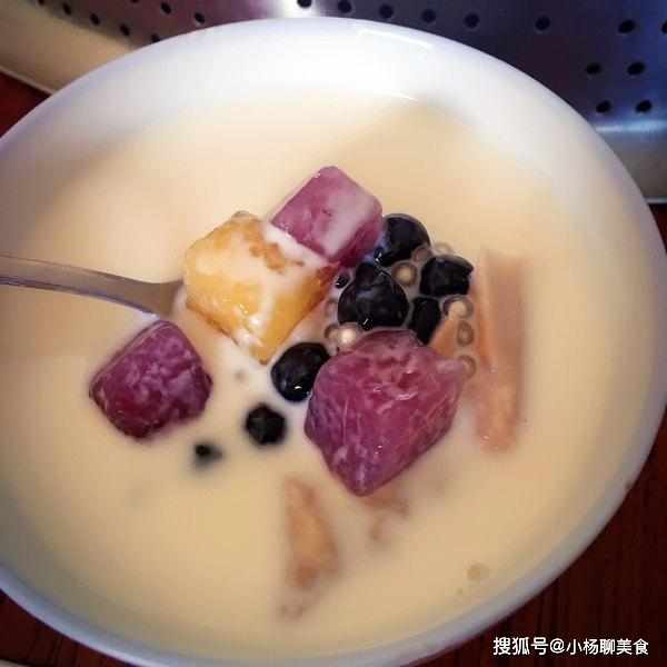 將薯泥和木薯粉混合攪拌,比例大概就是2:1,然後就可以慢慢的和了,在揉成團,在切成差不多大小的丁,用普通的麵粉稍微裹一下哎,以免沾,在開水下鍋,煮個大概5到10分鐘就可以啦。這裡芋圓就製作完成了。在將牛奶倒入碗中,放入煮好的西米,放一點煉乳和白糖或者蜂蜜,再放入剛剛蒸好的香芋塊,紫薯塊,紅薯塊。配料自己可以根據口味放哦,還可以放紅豆,珍珠等。