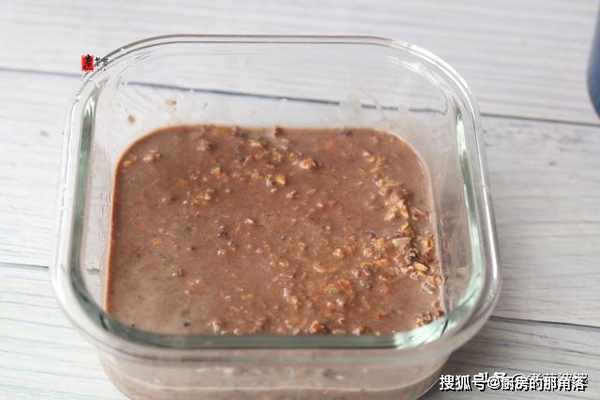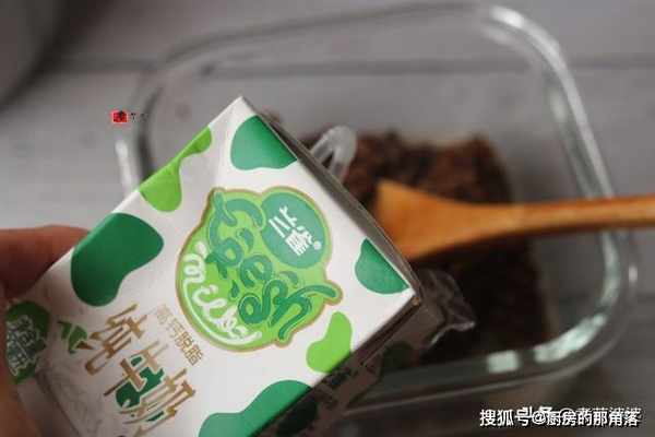 步驟3,把絞打好的可哥香蕉燕麥碎倒入玻璃烤碗中,倒入1盒蘭雀純牛奶。自從生娃後,我喝得最多的就是這款脫脂純牛奶了,它高鈣高蛋白,每100ml含120mg鈣元素和3.4g蛋白質,常喝營養高還不怕長肉肉,而且入口淡淡奶香。