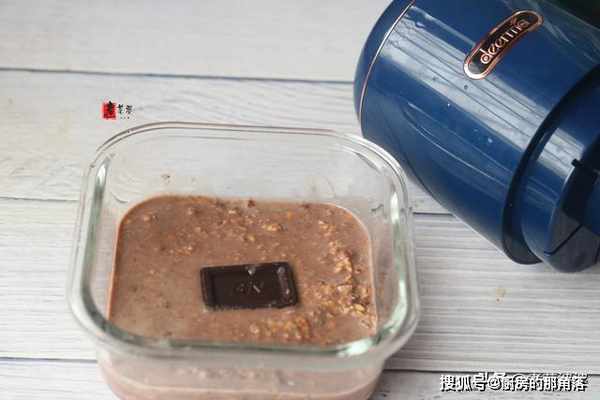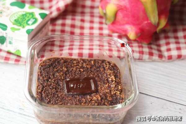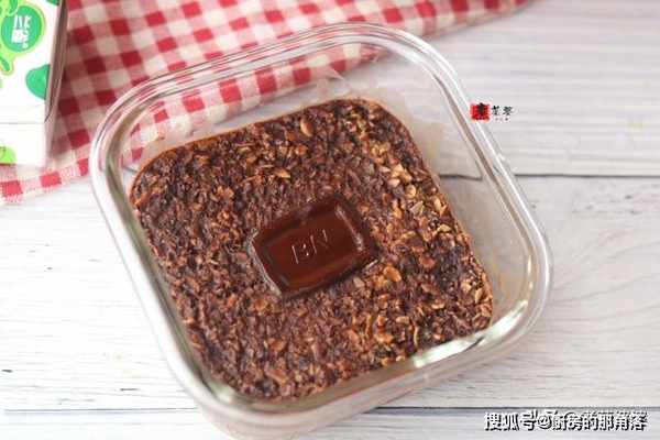 步驟5,拆開1塊100%黑巧克力,放入碗中。然後打開烤箱,預熱5分鐘,放入烤碗,上下火160°,烘烤10分鐘。烤完以後,就可以開吃了~黑巧克力有提高新陳代謝的作用,所以不建議替換哈~