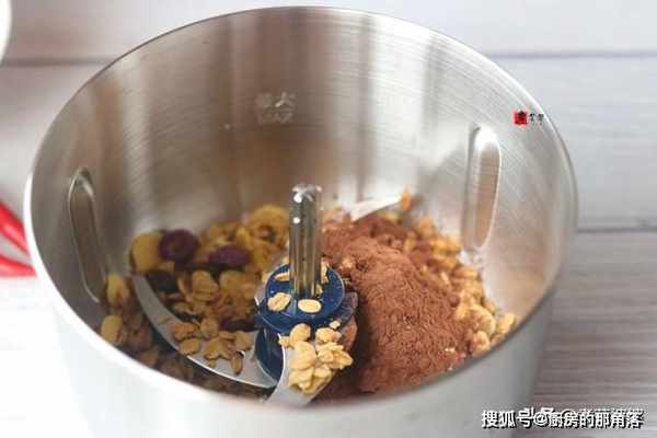 步驟2,拿出德爾瑪無線絞肉機,倒入切好的香蕉片、紅棗和多穀物燕麥片,加入1勺可哥粉。蓋上蓋子,啟動機器,將燕麥片絞打3~4次,打細一些。如果喜歡細膩綿軟口感的話,可以再多打幾次,將燕麥片打成細粉狀。