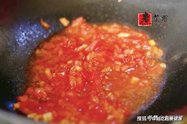 步驟四,大蒜拍扁,摳去外皮,切成碎末。拿出鐵鍋,倒入適量的清油,把油燒至5成熱,撒入大蒜碎末,接著把蕃茄粒全部放入鍋中。開中小火,慢慢翻炒,直到炒出紅色的湯汁。然後,加入1勺米酒汁、半勺生抽、半勺鹽拌勻。