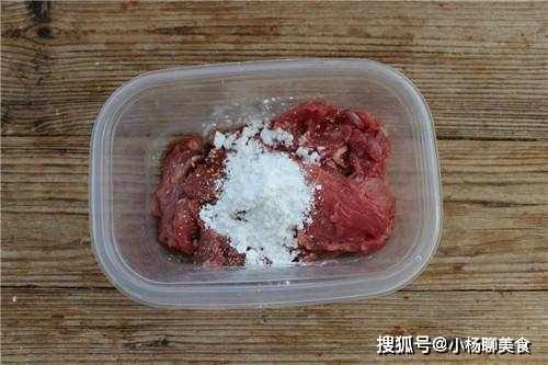步驟1:將200g牛肉放入水中清洗,簡單的清洗乾淨之後就將牛肉切成薄片,並且將切好的肉放入碗中,然後放入調料開始醃制。倒入半湯匙醬油,適量鹽,1茶匙胡椒粉,適量生粉,1湯匙料酒,適量糖,接著用手將牛肉快速的抓勻,並且將牛肉蓋上保鮮膜醃制上20分鐘。