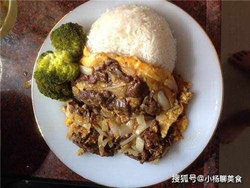 步驟3:鍋中倒入適量的油,燒熱之後就將洋葱下鍋,接著開始炒,炒到洋葱變透明之後就下入牛肉,快速的將牛肉和洋葱拌勻,並且炒到牛肉已經變色之後就可以淋上一點熱水。燒開之後就將雞蛋液下鍋,儘量淋的均勻一點,讓蛋液能蓋住牛肉。然後用小火慢慢的煎,差不多煎熟就可以出鍋,蓋在米飯上就可以吃了。