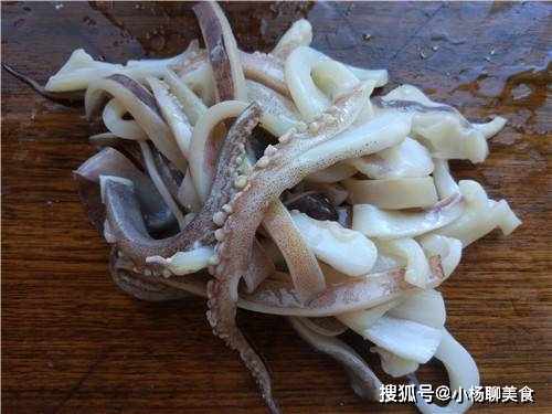 步驟1:拿出魷魚須,接著將魷魚沖洗乾淨,然後將魷魚須觸爪上的吸盤用堿仔細搓洗乾淨。緊接著將魷魚放在菜板上切好,放在碗中。然後在鍋中倒入適量清水,接著開始燒,燒到80°的時候將魷魚下鍋,快速的焯水到變色就快速撈出,瀝幹水分放在一旁備用。