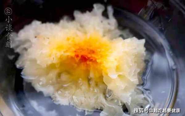 2、當我們看到銀耳後面的深黃色部位的時候,一定不要食用,其次,吃銀耳的時候,很多人為了追求口感,會加很多糖,這裡建議少加一些。