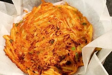 1、洋芋兩個擦絲,用水淘洗下,然後打兩個雞蛋,加入青蒜和香菜,加麵粉(根據自己喜歡菜多還是少,可酌量加水和麵粉),調成稠糊狀,然後加鹽和少許五香粉。
