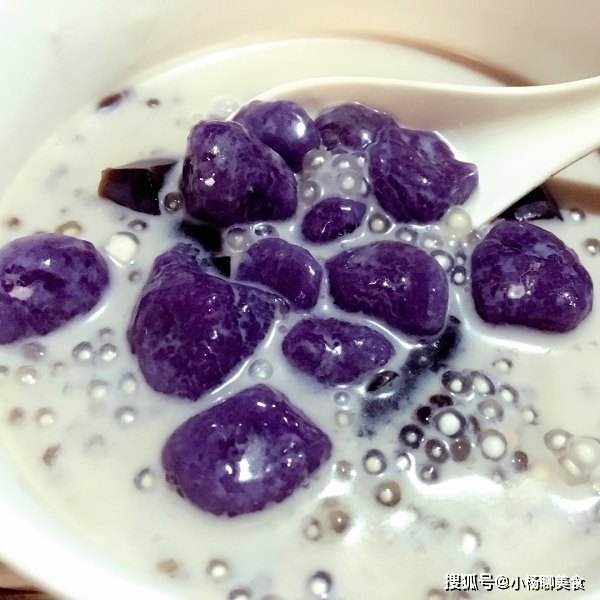9、煮芋圓。鍋裏燒開水後,加入做好的芋圓,等5,6分鐘全部浮上水後撈出,放入準備好的凉開水中,這步主要是新增芋圓的Q性。
