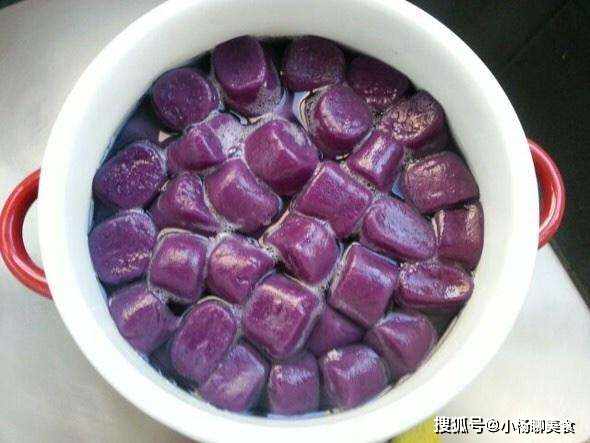 紫薯的解饞做法,色澤動人,唇齒留香,炎熱的夏天來一碗,過癮1、將紫薯放在阿迪鍋中蒸11分鐘到軟爛,去皮。