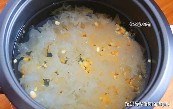 步驟3,拿出電鍋或是電燉鍋,家有砂鍋的用砂鍋,倒入玉米粒、白木耳塊,注入半鍋以上的清水,放回鍋體,接通電源,開啟相關模式。