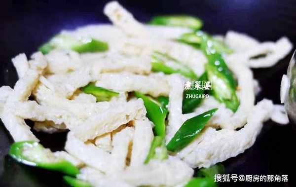 【青椒炒脆皮絲】【食材】:脆皮1塊、青尖椒2個、大蒜1個、蚝油半勺、鹽適量、油適量。