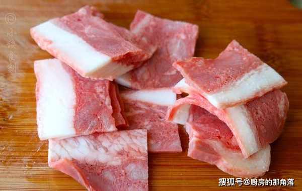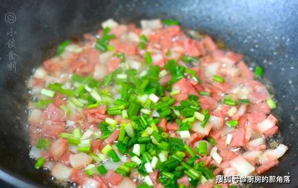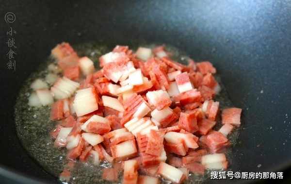 4、培根適量,把它切成丁,鍋中放入植物油燒熱以後,把切成丁的培根放進去開始煸炒,炒至顏色變深。