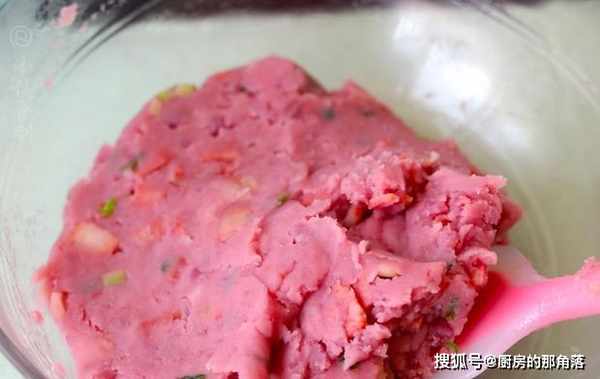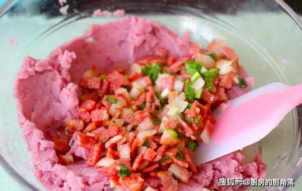 5、放入我們洗乾淨切成段的蔥花,直接關火,把炒好的培根再次放入到大的碗中,和紅心土豆泥一起拌勻。
