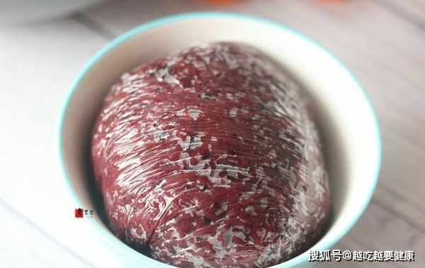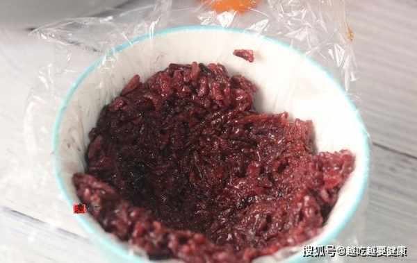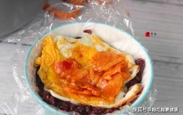 步驟6,拆開1包香辣蘿蔔乾,均勻地撒在雞蛋表面,然後繼續盛出1勺紫糯米,蓋在表面。小碗裝滿後,拉起保鮮膜,將紫糯米包裹起來,用手握捏緊實,並整理好形狀。
