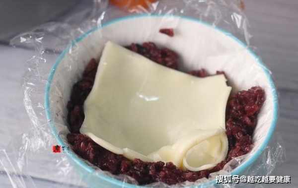 步驟5,打開1片高鈣起司片,放入紫糯米碗中,接著撒上1層肉鬆,夾入煎好了的香酥雞蛋。