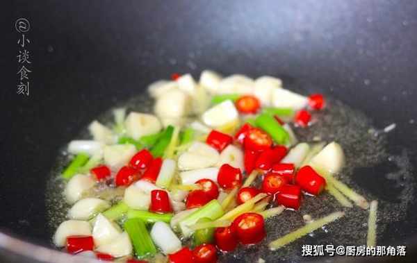 2、鍋裏放入植物油,燒熱以後,放入葱白,還有切好的蒜丁以及切成絲的薑,還有小米辣圈,不吃辣的話不用放小米辣圈。