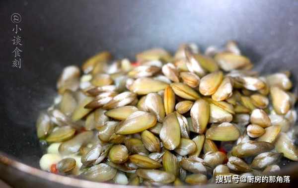 4、繼續翻炒,這個時候我們可以注意海瓜子有沒有開口,如果開口的話,可以放入鹽進行調味,然後放入生抽2勺提鮮。