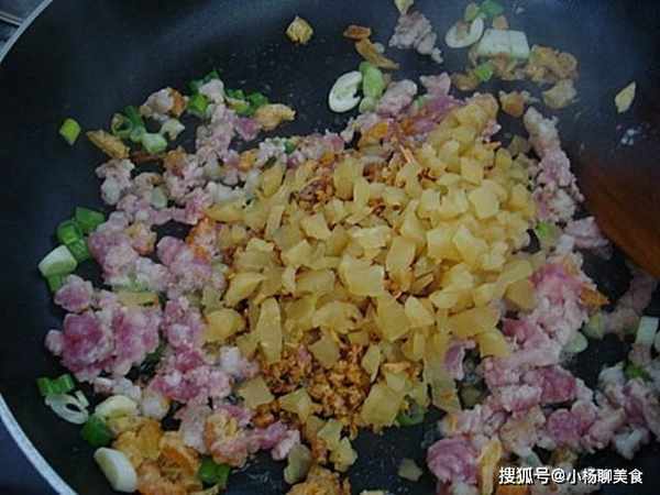 再下菜圃(豆干丁)油葱酥續炒.炒出香氣……取出1/3炒好的料.留待最後鋪在表面~~~