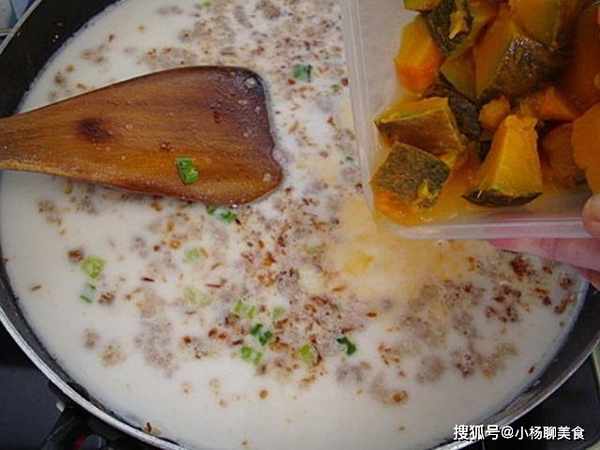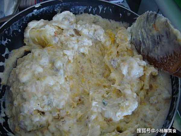 然後把已經調好的粉漿加進去……這個時候就可以調味了……最後下南瓜……繼續絆炒