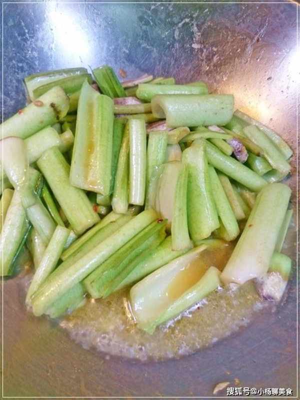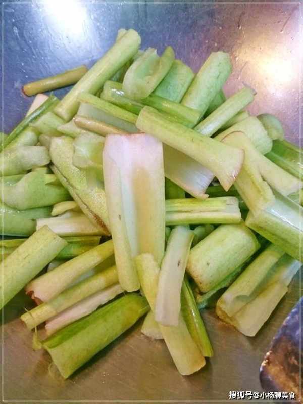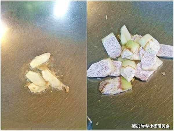 鍋裏先放少許油爆香薑片後先入質地較硬的芋片翻炒幾下再入質地較軟的青綠芋梗。