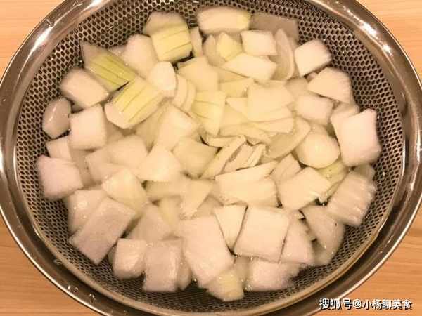 1.洋葱切成約2公分塊狀,泡冷開水(或乾淨的水)水10分鐘,倒掉再泡新的水10分鐘,味道會比較不嗆辣。(喜歡嗆辣味的可以泡1次,或是省略此步驟也可,我是超怕洋葱嗆腦門的~)