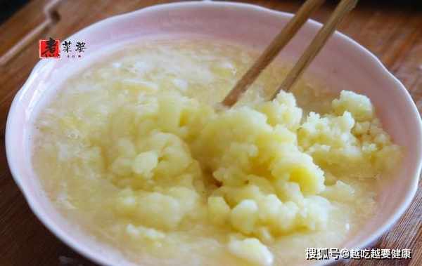步驟3,把撈出來的洋芋塊,放入盤子中,用勺子碾壓成泥狀。然後,撒入半小勺鹽、少許胡椒粉、3勺清水,攪拌均勻成不濃不稠的泥狀。