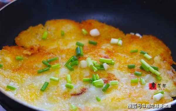 步驟5,煎到洋芋粑粑底部凝固成形,表皮金黃以後,掂鍋翻面,煎3~5分鐘,一直到洋芋粑粑金黃酥脆出鍋裝盤。當然,掂不了鍋也沒關係,可以先倒出在盤中,然後將盤倒扣在鍋中,繼續煎。裝盤以後,洗1根香葱,切成蔥花,撒在盤中。