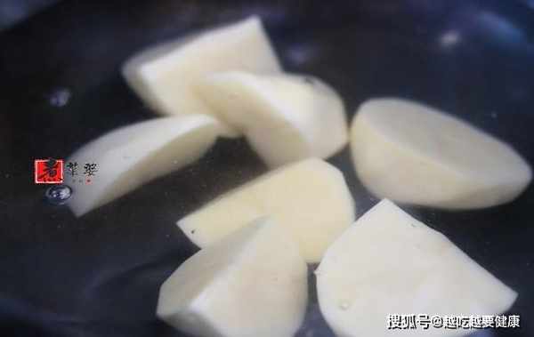 步驟2,把切好的洋芋塊放入鐵鍋中,加入稍多一些的清水,大火煮沸,轉中火燜煮8~10分,關火,撈出洋芋塊。家裡有蒸鍋的話,可以切小點直接蒸,蒸到軟爛,用筷子能輕鬆戳穿為止。