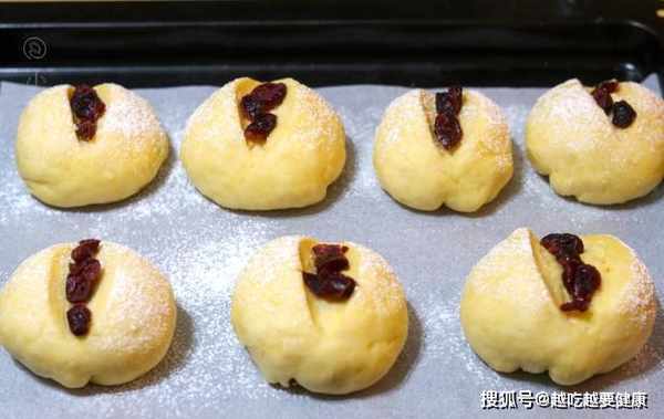5、發酵好的麵包取出來,放入蔓越莓,然後放上一層糖粉,繼續放入烤箱中,上下180度,烤10到15分鐘。