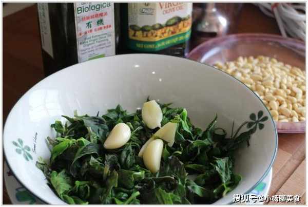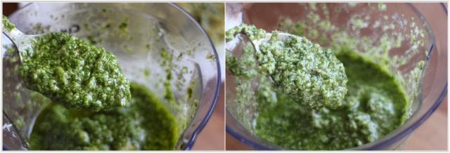 右邊顏色淡的是之前做的,用生蒜沒煮過的羅勒,左邊這份是廚神的版本,燙過的羅勒顏色更墨綠些,但味道柔和許多。