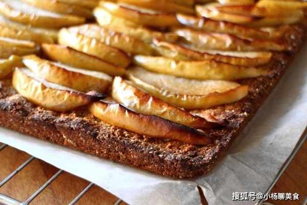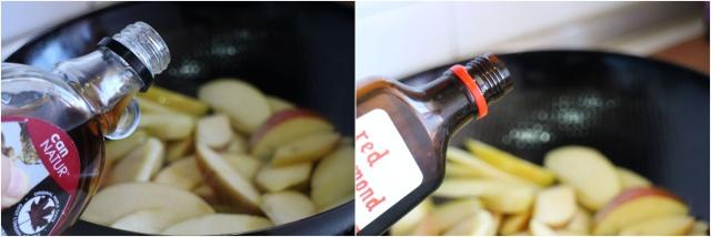 鍋裏加熱椰子油放入去核切片的蘋果,炒5分鐘後拌入楓糖漿和香子蘭精,用小火煮將蘋果煮軟轉為褐色