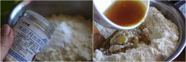 杏仁粉、薏仁粉、燕麥片、無鋁打泡粉這些乾粉類全部放入碗中,加入楓糖漿、香子蘭精和橄欖油拌勻