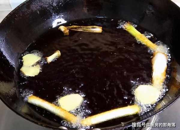 第三步:把準備好的葱、薑、桂皮和香葉用清水洗乾淨,然後把表面的水分瀝幹,把葱切成段,把薑切成片;接著在鍋中加入適量的油,油燒熱以後,把葱薑、桂皮和香葉放進油鍋中小火慢炸,等到食材的香味炸出來,變得焦黃了,把食材都撈起來,把鍋中的油晾一會兒。