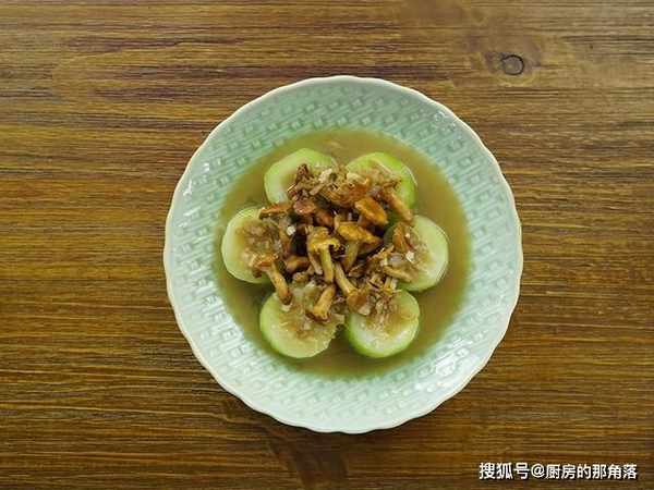 瓠瓜1條、雞油菇60克、瑤柱2湯匙、紅蔥頭1粒、蒜頭2瓣、高湯4湯匙、紹興酒1茶匙、鹽少許、糖少許、太白粉水少許