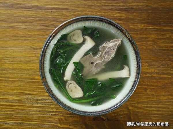 先以排骨熬湯,煮出清甜湯頭,再加入切片的草菇及杏鮑菇,不怕久煮失去口感,也不用擔心烹調時間短而不熟,簡單的鹽、糖、胡椒粉調味即可,最後再加入主角菠菜;