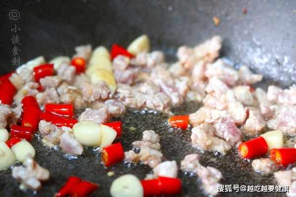 4、另起鍋放入植物油,油溫7成熱的時候,放入猪肉開始炒,再放入蒜瓣還有小米辣把它炒香,放入少許的白胡椒粉去腥。